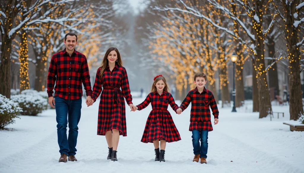 Plaid is a quintessential Christmas print that never goes out of style. A plaid family look adds a cozy, rustic feel to your Christmas photos, making it ideal for family portraits by the fire or outdoors in the snow. For dad, a red and black plaid shirt paired with dark jeans creates a rugged yet festive vibe. Mom can wear a plaid dress or a plaid scarf layered over a solid top, and the kids can wear plaid shirts or skirts to match.