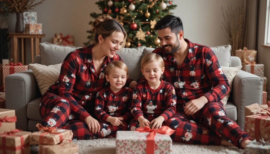 For a fun and relaxed family photo look, consider matching Christmas pajamas! This is a perfect choice for families who love to spend Christmas morning in cozy loungewear before getting dressed for the day. You can opt for classic red plaid pajamas for the whole family, or go for something fun like reindeer prints or Santa-themed designs. It’s a playful way to celebrate the season while still coordinating your looks for the photo.