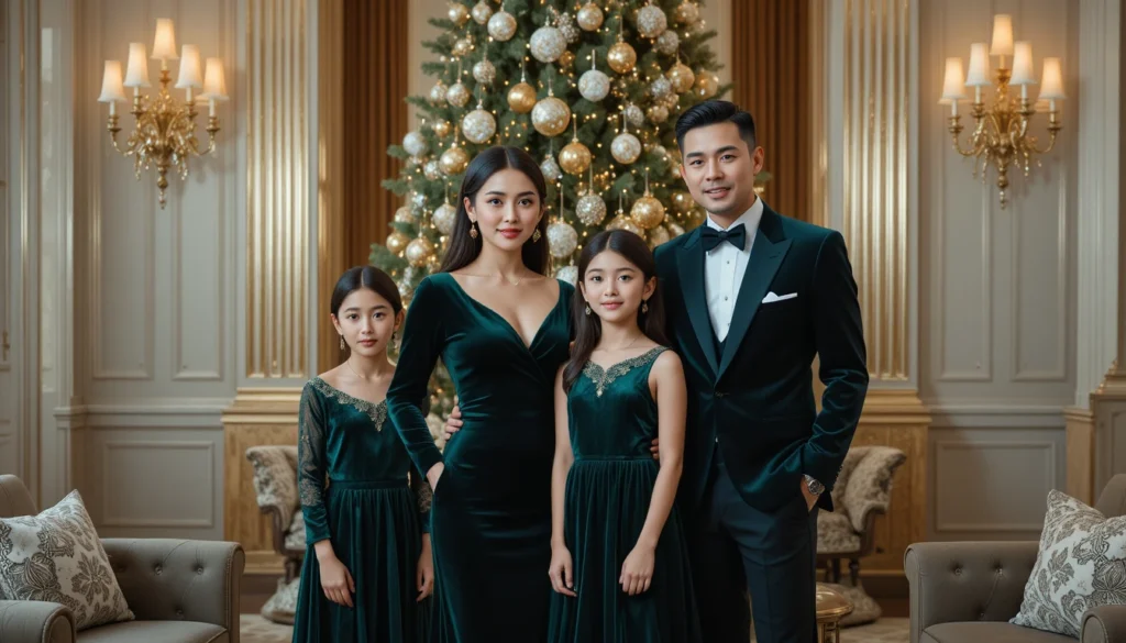 For families that love to dress up for Christmas photos, velvet is the way to go. An elegant velvet dress for mom in a deep emerald green or rich red creates a glamorous look, while dad can wear a velvet blazer with dark trousers. The kids can join in with velvet dresses or suits, making the entire family look like they just stepped out of a holiday fashion magazine.