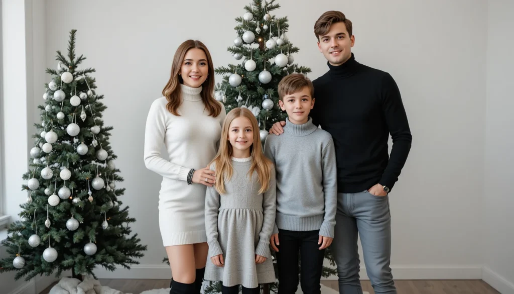 For families who prefer a more understated approach, neutral family outfits are an excellent choice. Picture everyone dressed in soft shades of cream, beige, and grey, with outfits that complement each other while avoiding bold, overpowering colors. For instance, mom can wear a soft cream sweater paired with a grey skirt, while dad rocks a simple beige sweater with dark jeans. The kids can wear coordinating tones with neutral sweaters and beige chinos. The overall look will give your Christmas photos a calm, serene vibe.