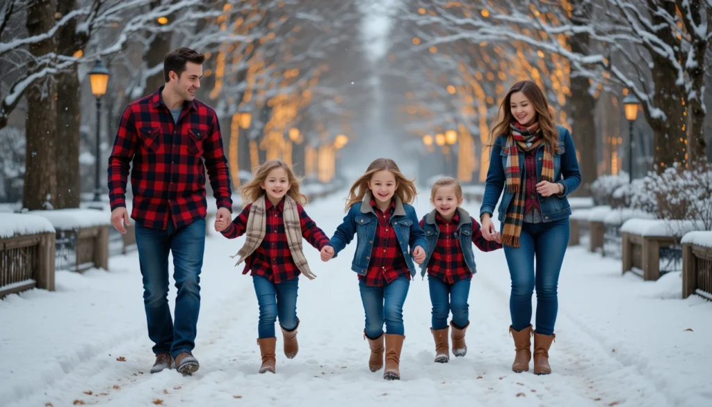 This is a great option for outdoor Christmas photos or casual holiday walks in the snow. The plaid patterns bring that cozy Christmas feel, while the denim adds a relaxed, laid-back vibe.