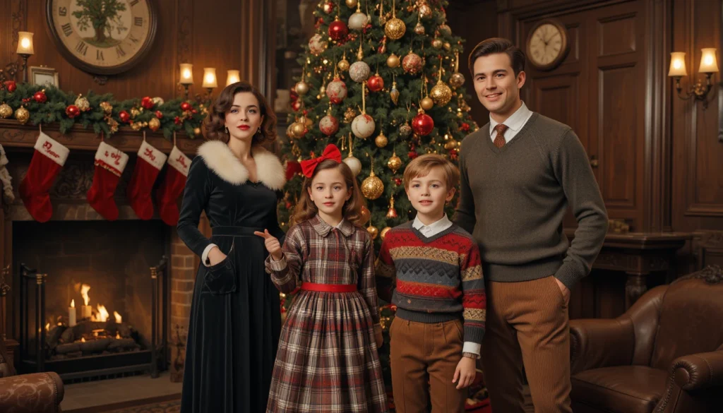 If you love the charm of retro fashion, why not dress the family in vintage-inspired Christmas outfits? Think faux fur collars, vintage knit sweaters, and mid-century plaid for a nostalgic feel. This look adds a touch of old-school glamour to your Christmas photos, with everyone looking dapper in festive hues of red, green, and gold.