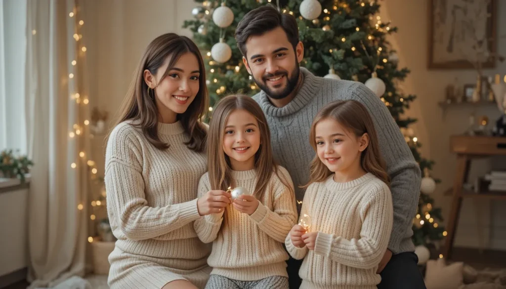 Accessorize with neutral scarves and light brown boots for a cohesive, warm look. These outfits work wonderfully in natural light settings, whether you’re outdoors under the snow or indoors by the Christmas tree. The neutral palette is timeless, ensuring that these family photos will still look fresh for years to come.