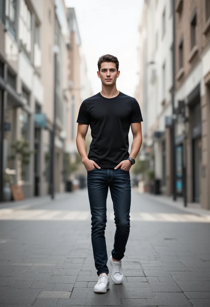 A black tee always looks sharp, and when paired with dark jeans, it creates a sleek, confident vibe. Girls love this because it feels clean, bold, and simple — no extra effort, but still very impressive. White sneakers brighten the outfit and make it look modern.