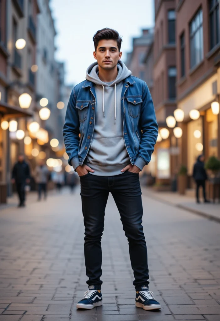 Layering a hoodie under a denim jacket gives a stylish and cozy look. It feels playful, warm, and approachable, which girls find very comforting and cute. The dark jeans add balance and make the whole outfit look sharp.