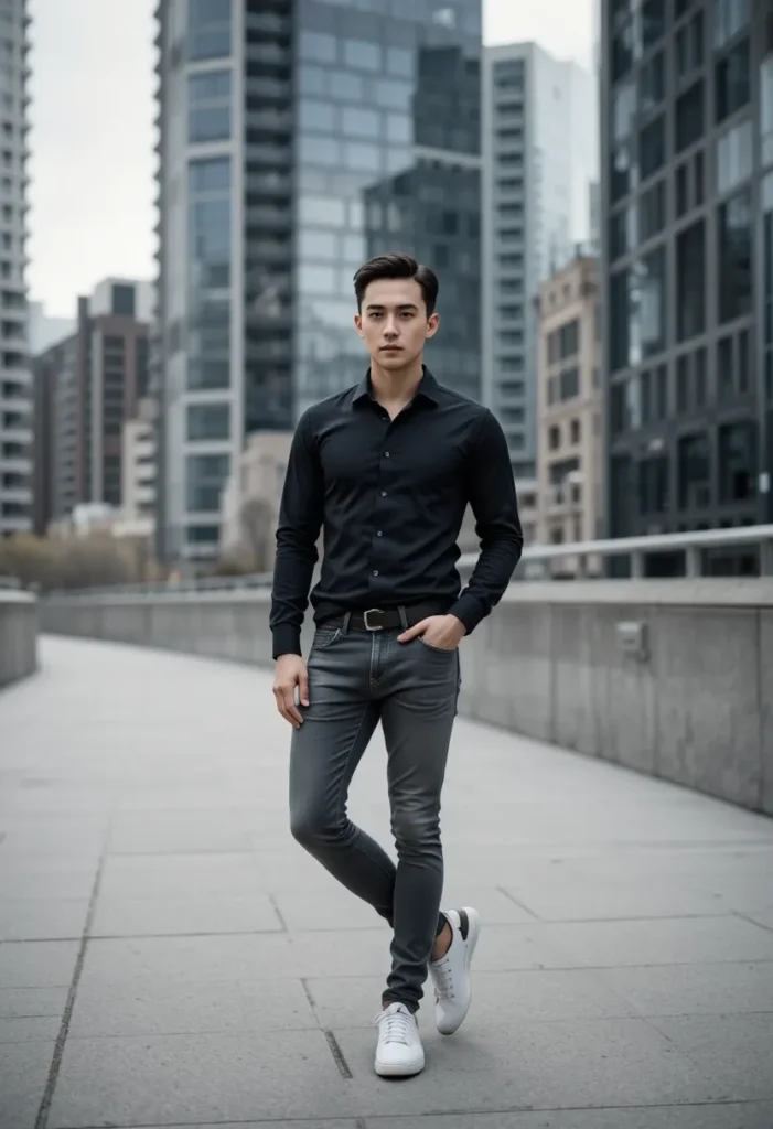 For a sleek and polished spring look, a black button-down shirt paired with grey jeans is a great choice. The black shirt offers sophistication, while the grey jeans keep things casual yet modern. This look is perfect for evening outings, dates, or even a smart-casual day at the office.