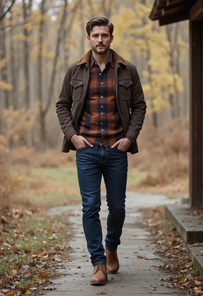 For an easy-going yet polished look, a plaid button-down shirt paired with dark blue jeans is a great go-to. The plaid shirt brings texture and color to the outfit, while the dark jeans keep things grounded and add a touch of sophistication. This look is perfect for casual Fridays at work or a weekend coffee date with friends.