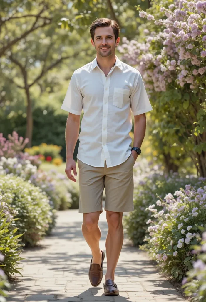 When the temperature rises, a light blue button-down shirt paired with white shorts is the perfect combination for staying cool while looking sharp. The light blue shirt offers a refreshing, breezy vibe that’s perfect for spring, while the white shorts keep the outfit relaxed and perfect for outdoor activities.