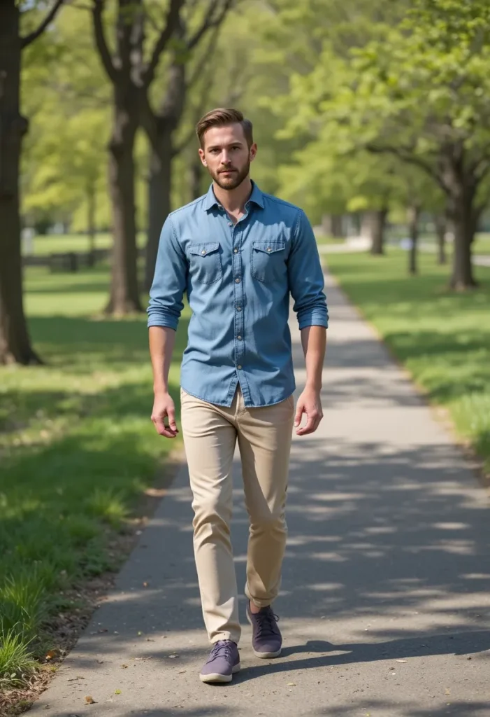 For a more rugged, laid-back look, pair a denim button-down shirt with olive green pants. The denim shirt offers a classic, timeless vibe, while the olive pants add a touch of earthiness to the outfit. This combination is perfect for casual days spent outdoors or hanging out with friends.