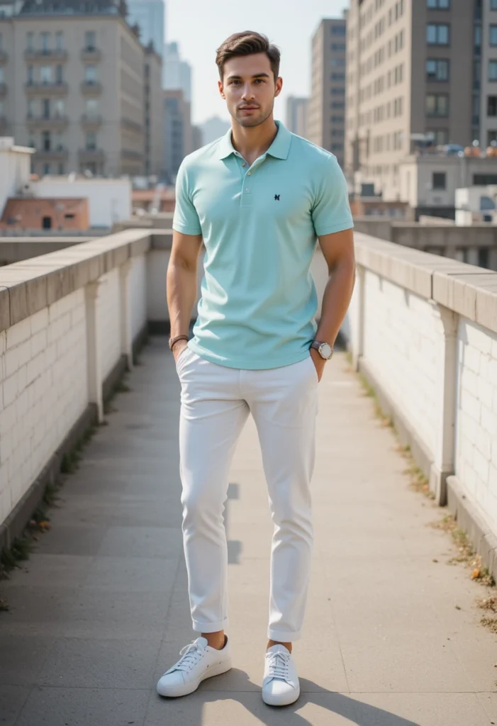 A pastel polo — mint, peach, or baby blue — paired with white linen pants exudes soft sophistication. The light tones and airy fabric make it perfect for scorching afternoons.