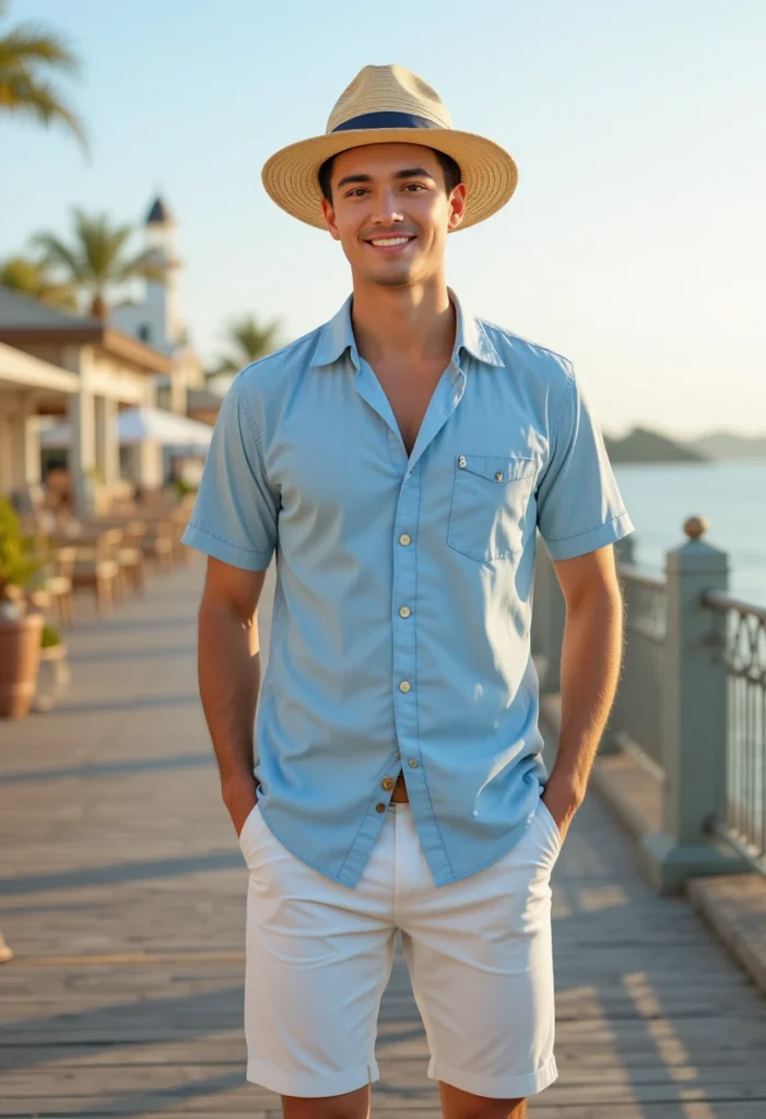 Top it off with sunglasses and a bracelet for subtle flair. It’s a timeless look that balances relaxation and refinement, ideal for men who prefer classic summer charm with a modern touch.