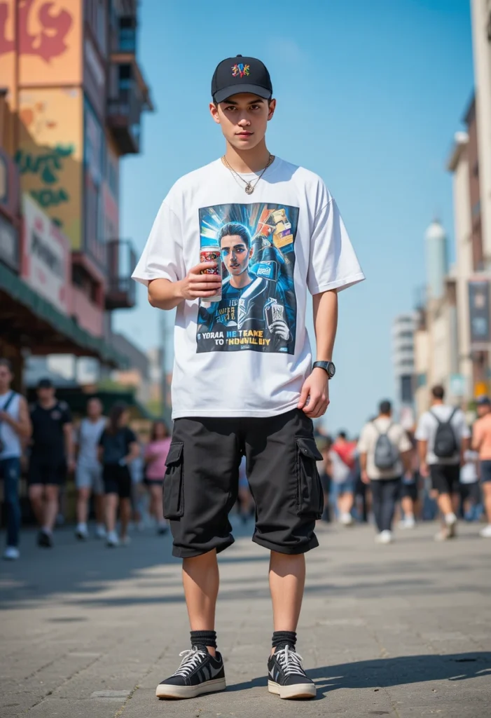 For streetwear lovers, this outfit defines cool comfort. The oversized tee with bold graphics adds character, while black cargo shorts bring utility style into play.