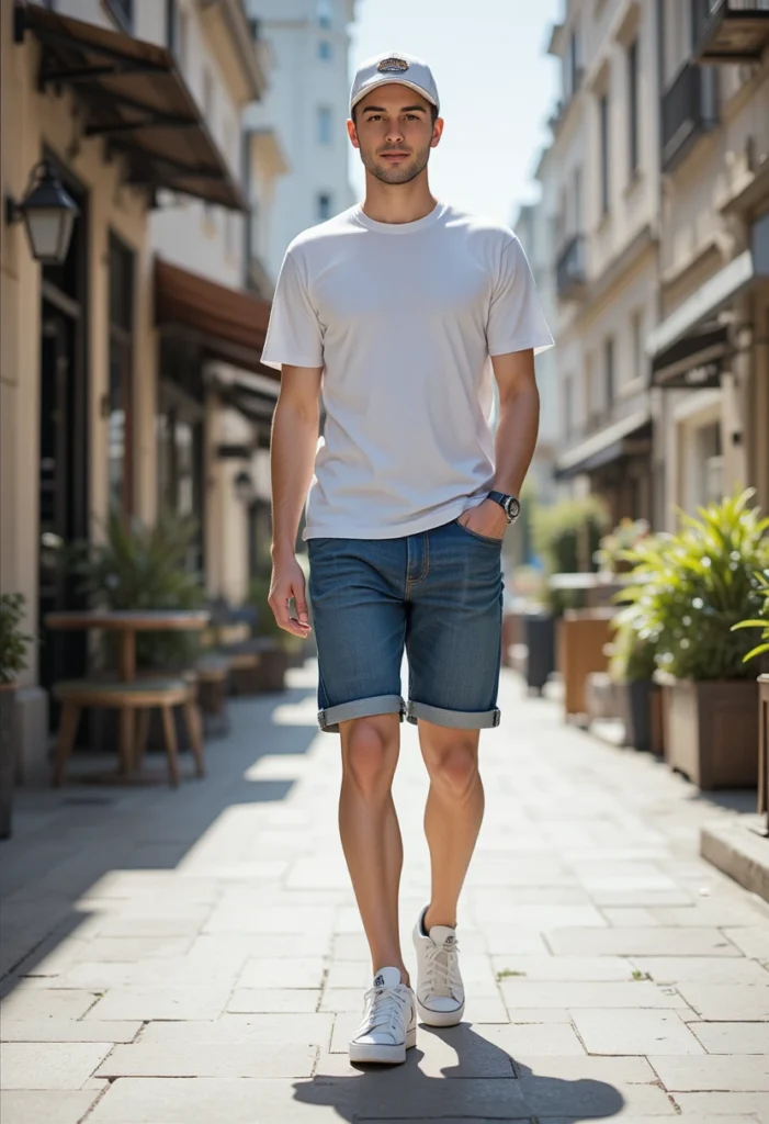 7. White T-Shirt + Blue Denim Shorts + Low-Top Sneakers + Cap