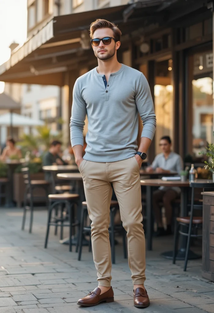 8. Light Grey Henley Shirt + Khaki Pants + Loafers + Sunglasses