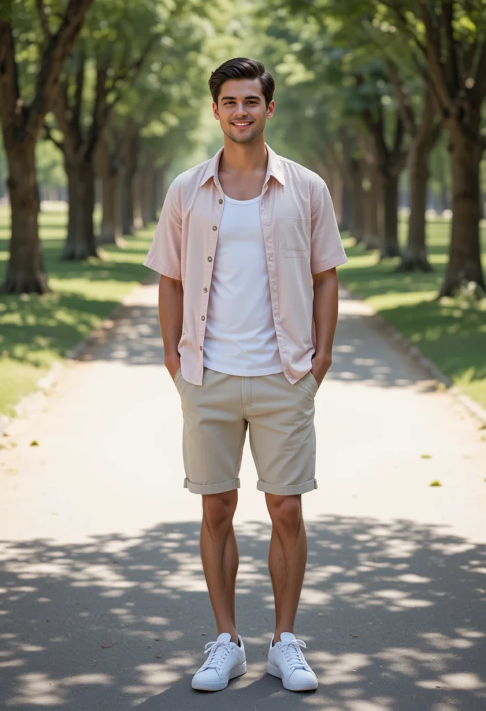The white linen shirt is a summer essential — cool, crisp, and classy. Paired with sand-coloured shorts and brown loafers, it offers that clean, Mediterranean-inspired vibe perfect for morning brunches or evening strolls by the sea.
