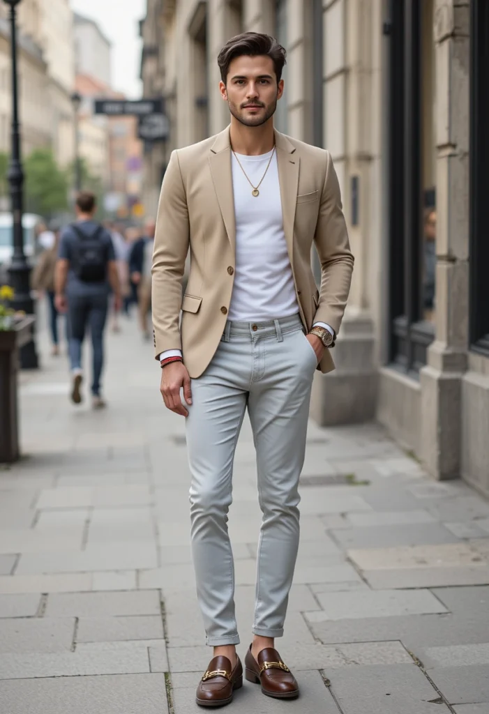 Smart-casual perfection. A beige blazer instantly elevates a white tee and light jeans combo, blending comfort with sophistication.