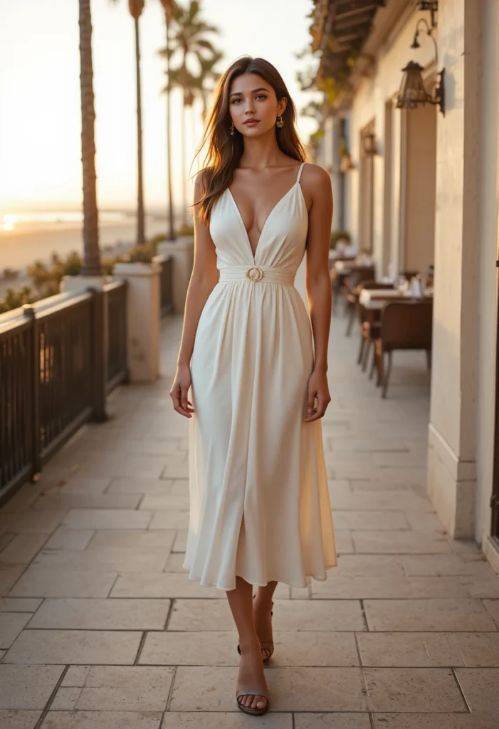 Pair it with minimal leather sandals and gold accents for the ultimate refined summer outfit. The look works beautifully for sunset dinners, weekend getaways, or special daytime events. It feels elevated but never over-the-top, making it a versatile wardrobe staple.