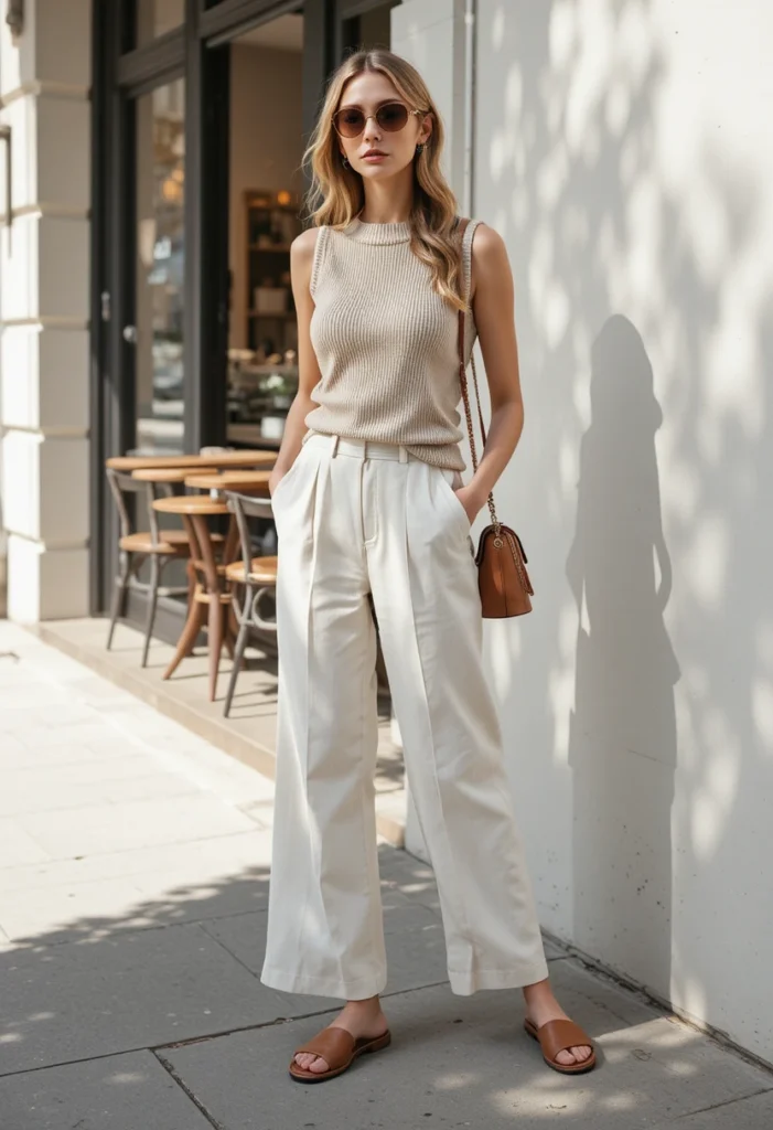 This outfit is where comfort meets sophistication. A soft sleeveless knit top paired with wide-leg linen trousers creates a relaxed yet refined silhouette. It’s an easy combination that feels airy without looking too casual.