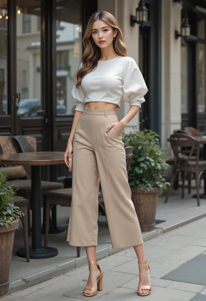 A puff-sleeve crop blouse paired with high-waisted culottes strikes the perfect balance between trendy and sophisticated. The silhouette flatters the waist and creates a clean, graceful shape that’s perfect for summer. The airy culottes keep things breezy and comfortable.