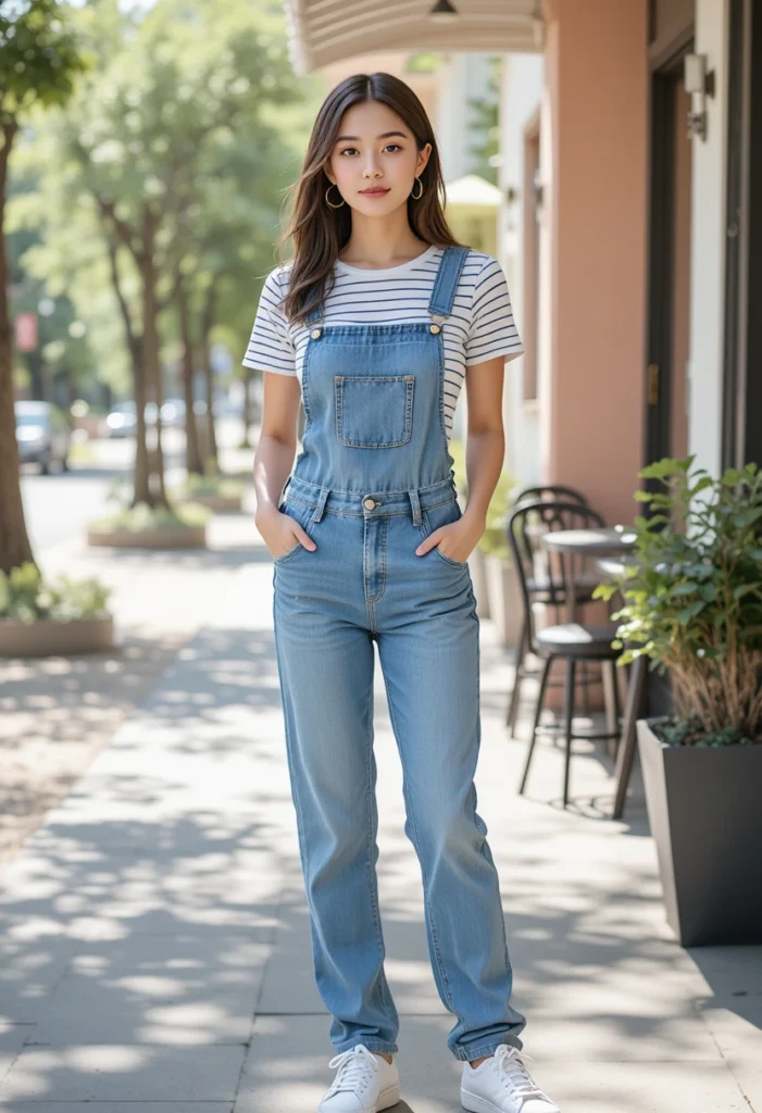 Denim overalls are playful, timeless, and super easy to style. When paired with a fitted tee, especially in white or stripes, they instantly create a cute and casual summer outfit. The look feels youthful and comfortable, perfect for everyday wear.