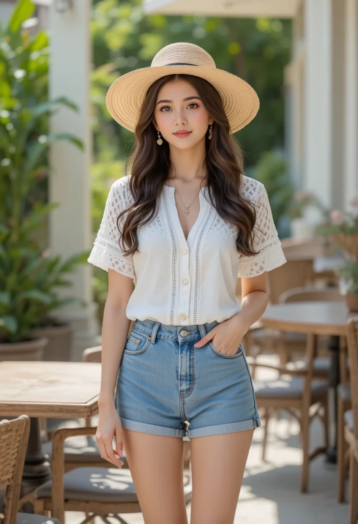 An eyelet blouse brings the prettiest summer texture with its delicate, breathable design. When tucked into high-waisted denim shorts, it creates a perfect blend of casual and feminine. The contrast between structured denim and soft eyelet fabric feels fresh and timeless.