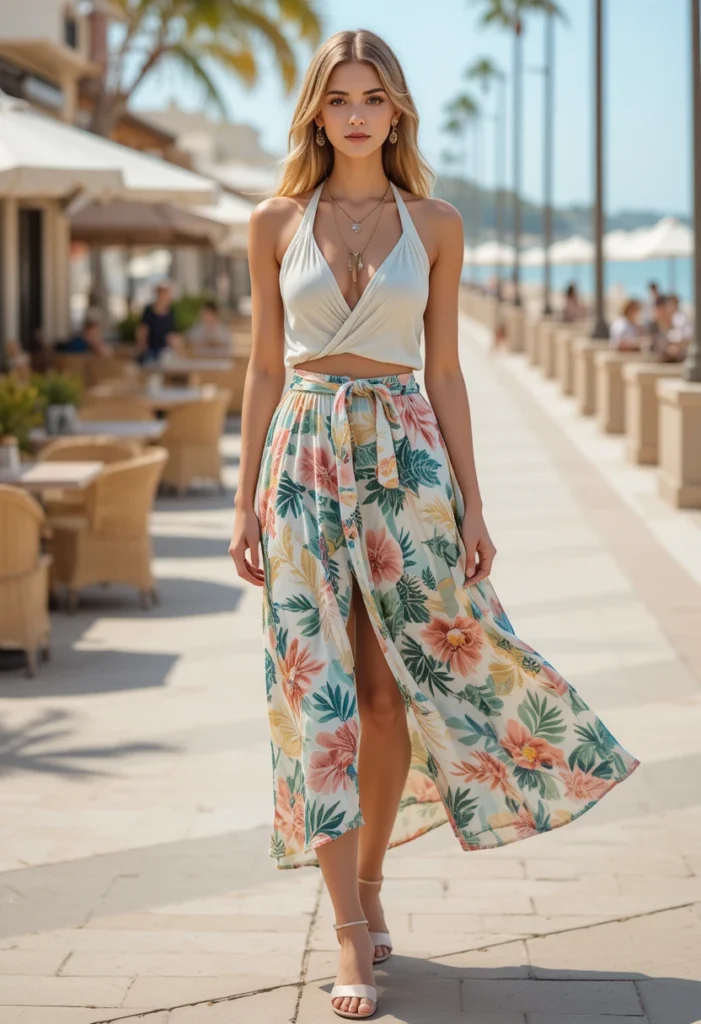 Pair it with espadrilles or block heels for a balanced, picture-perfect outfit. Add hoop earrings or a small pendant necklace for just the right touch of sparkle. This look is ideal for brunch dates, sunset dinners, or beachside evenings.