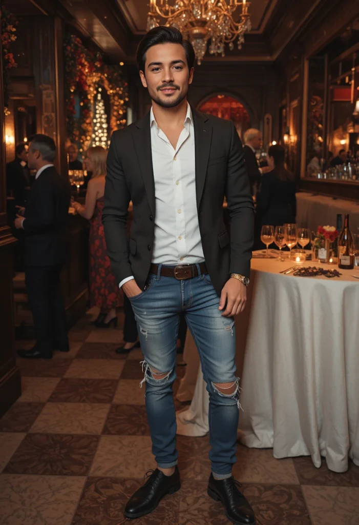 What to Wear to a Casual Christmas Party: The casual blazer and distressed jeans balance festive style with modern casualness.