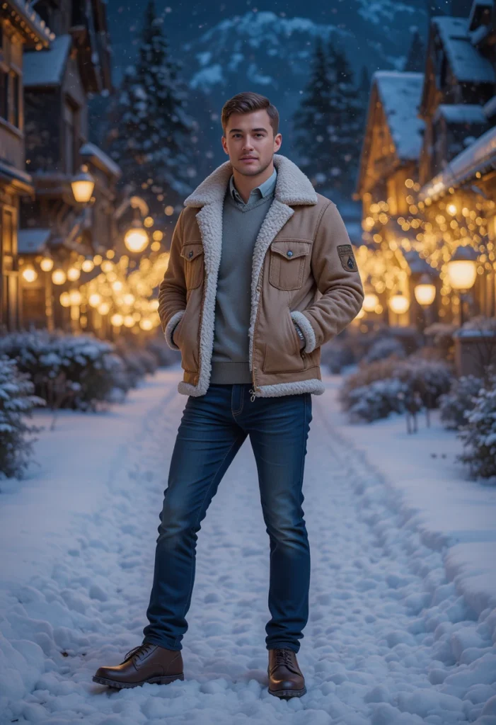What to Wear to a Christmas Outdoor Gathering: The sherpa jacket and slim jeans provide both warmth and style.