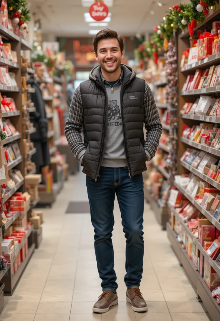 For a more laid-back, sporty look, a puffer vest paired with dark blue jeans offers warmth and comfort. This is a great outfit for a Christmas outing where you need extra warmth, such as Christmas shopping or a holiday walk in the park.