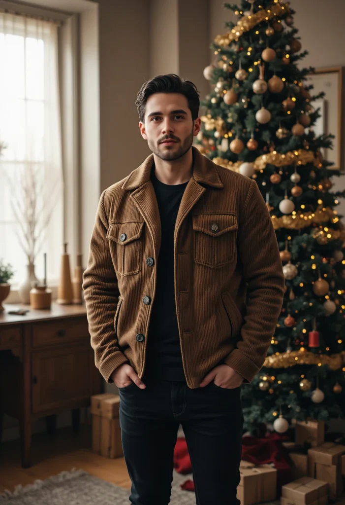 A corduroy jacket in a warm tone like camel or deep burgundy, paired with black jeans, offers a sophisticated and cozy holiday look. The corduroy texture adds a festive feel, while the black jeans keep it casual.