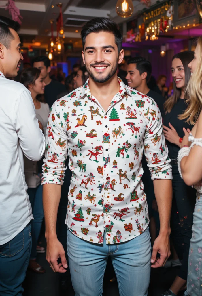 What to Wear to a Christmas Party: The Christmas-themed button-down shirt and light jeans are perfect for a fun and festive holiday gathering.