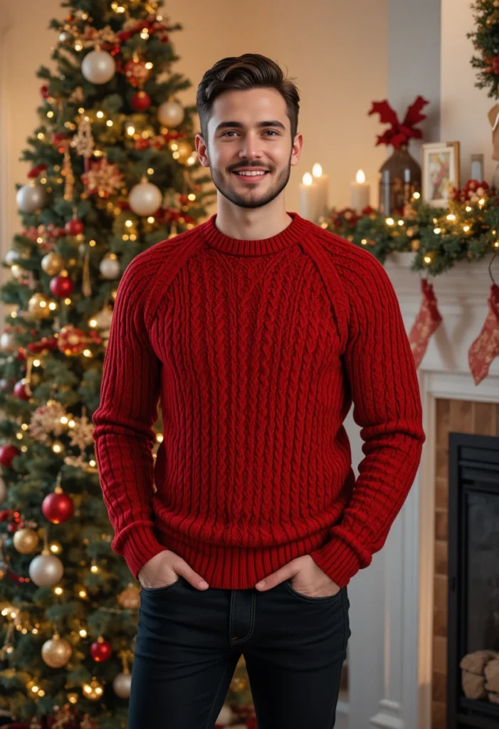 For a bold and festive look, a red cable-knit sweater paired with black jeans is an excellent choice. The chunky knit provides a cozy feel, while the vibrant red color screams Christmas cheer. This outfit is perfect for family gatherings or a holiday brunch.