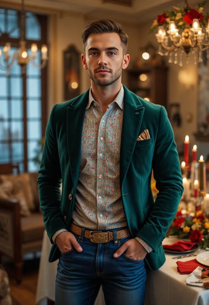 What to Wear to a Christmas Dinner Party: A velvet blazer and blue jeans combine festive elegance with casual comfort.