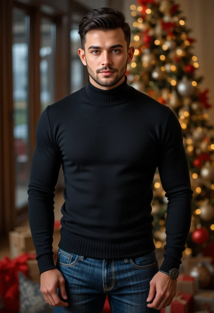 A black turtleneck paired with slim-fit jeans is a sleek, modern take on Christmas fashion. The simplicity of the turtleneck, paired with the tailored fit of the jeans, gives this outfit a sophisticated feel while keeping it casual.