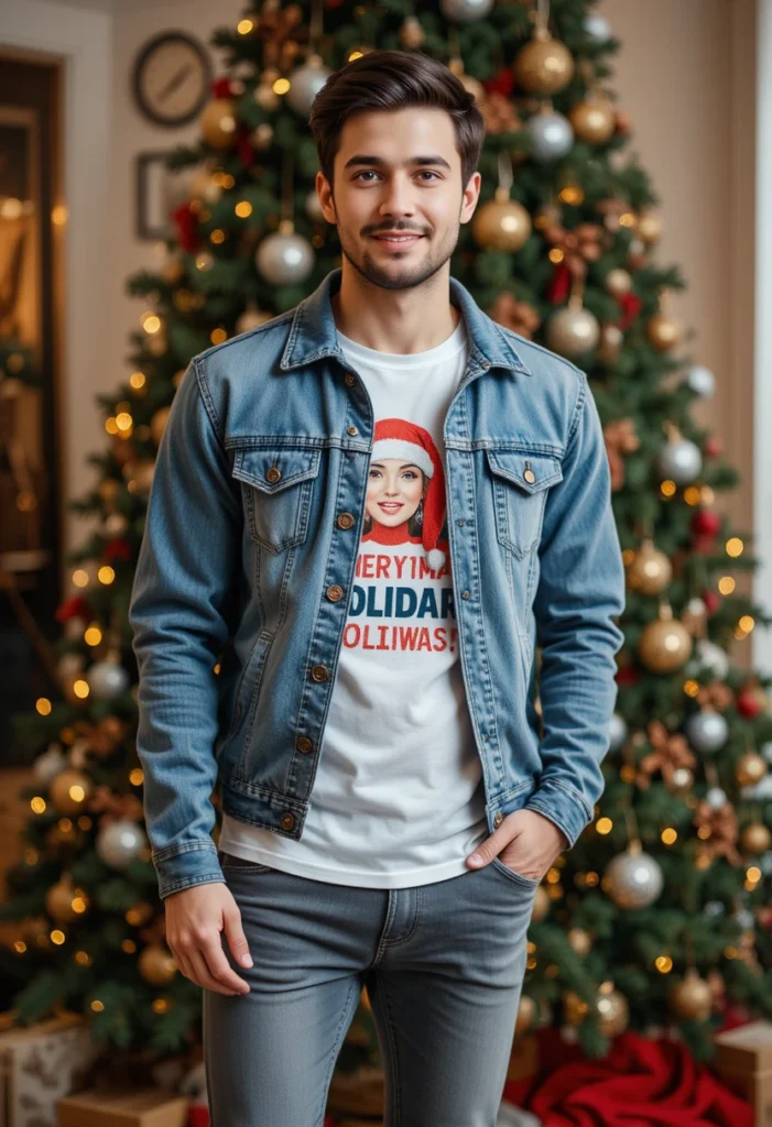 A classic denim jacket over a graphic Christmas tee paired with gray jeans offers a cool, laid-back Christmas outfit. The graphic tee adds a fun element, while the denim jacket keeps things casual and stylish. Perfect for a Christmas movie night or a casual family gathering.
