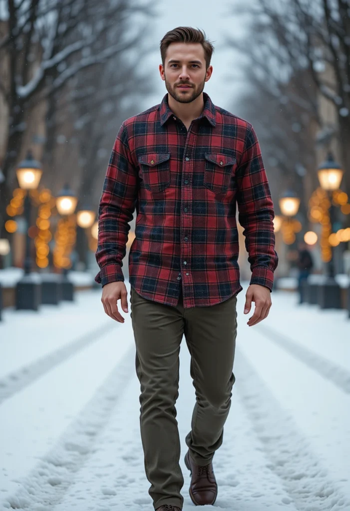 A plaid flannel shirt in warm tones paired with olive green jeans offers a more rugged, outdoor Christmas vibe. This outfit works great for casual outdoor holiday events, like ice skating or a walk in the snow.