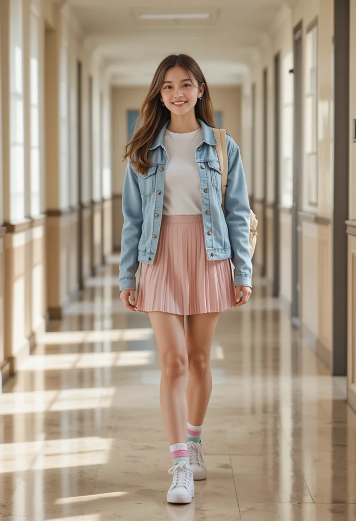 For a little extra flair, throw in pastel socks or a delicate bracelet. The mix of denim and pleats brings that perfect blend of cool and feminine — a go-to outfit for 2025’s everyday school style.