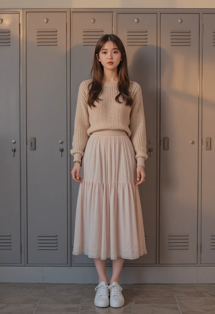 Soft knit sweaters and midi skirts are the perfect duo for a cozy school outfit. Choose neutral or soft tones for a gentle, elegant vibe. The flowing skirt adds movement, while the sweater keeps you warm and comfortable.
