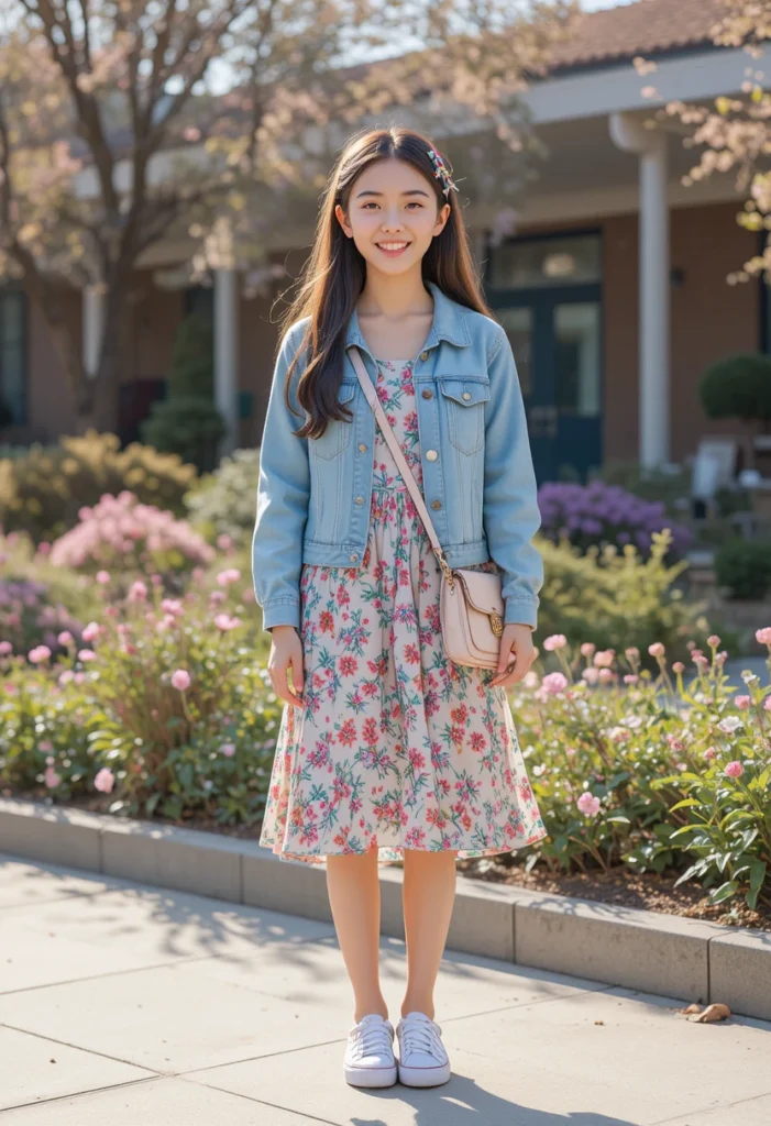 A floral dress paired with a denim jacket makes the ultimate cute-and-classic school outfit. Choose light, breezy fabrics for spring and summer, or layer with tights when it’s chilly. The combo feels soft, feminine, and cheerful — perfect for brightening any school day.