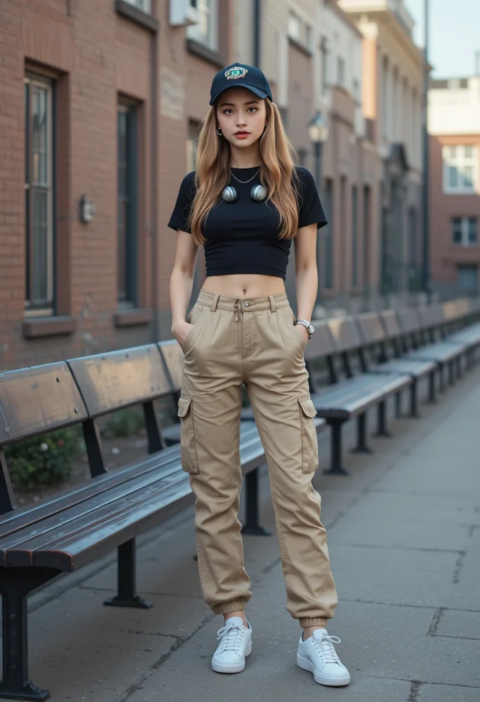 Finish the outfit with sneakers or combat boots and accessorize with a cap or headphones. Earthy colours like khaki, beige, or black make this style stand out. It’s the ultimate outfit for girls who love a sporty, streetwear-inspired vibe.