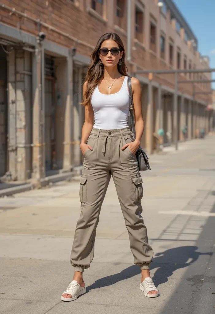 A tank bodysuit gives a smooth, fitted base that pairs perfectly with the relaxed look of cargo pants. It’s comfortable, stylish, and great for hot days with lots of movement.