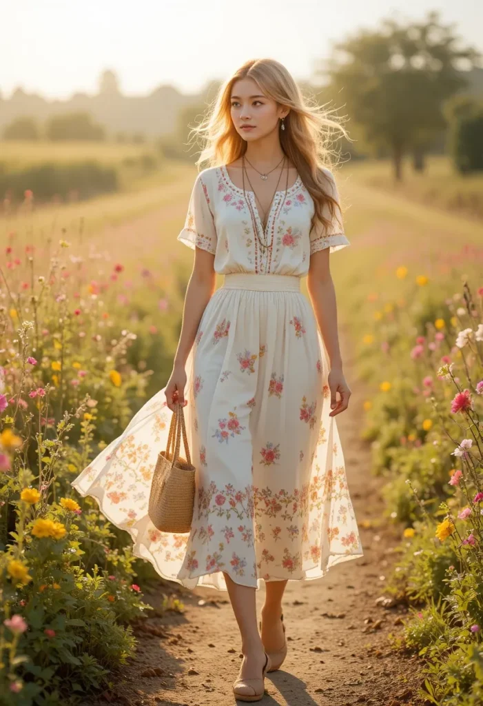 Add espadrilles, layered necklaces, and a straw bag to complete the cottage-core inspired look. It’s beautiful for picnics, day trips, and warm-weather adventures.