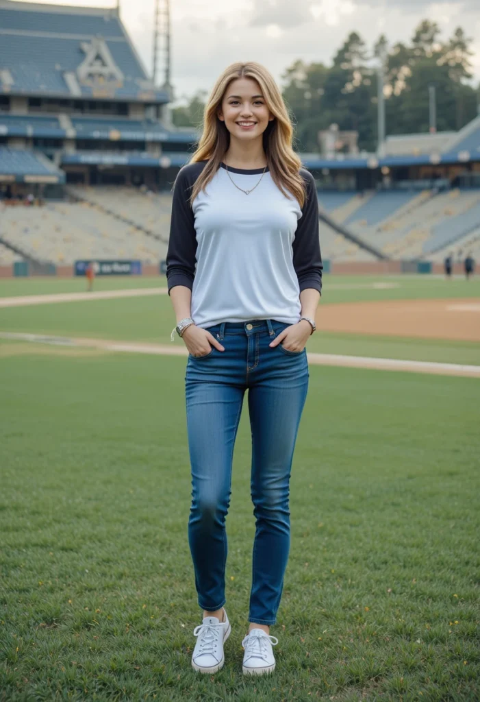 A baseball-style tee with contrasting sleeves gives the perfect sporty vibe without feeling overdone. Pairing it with comfortable jeans makes it easy to move, cheer, and stay relaxed throughout the entire game. It’s a go-to look for moms who want something simple but still cute. Add a cap, and the outfit feels even more effortless and game-ready.