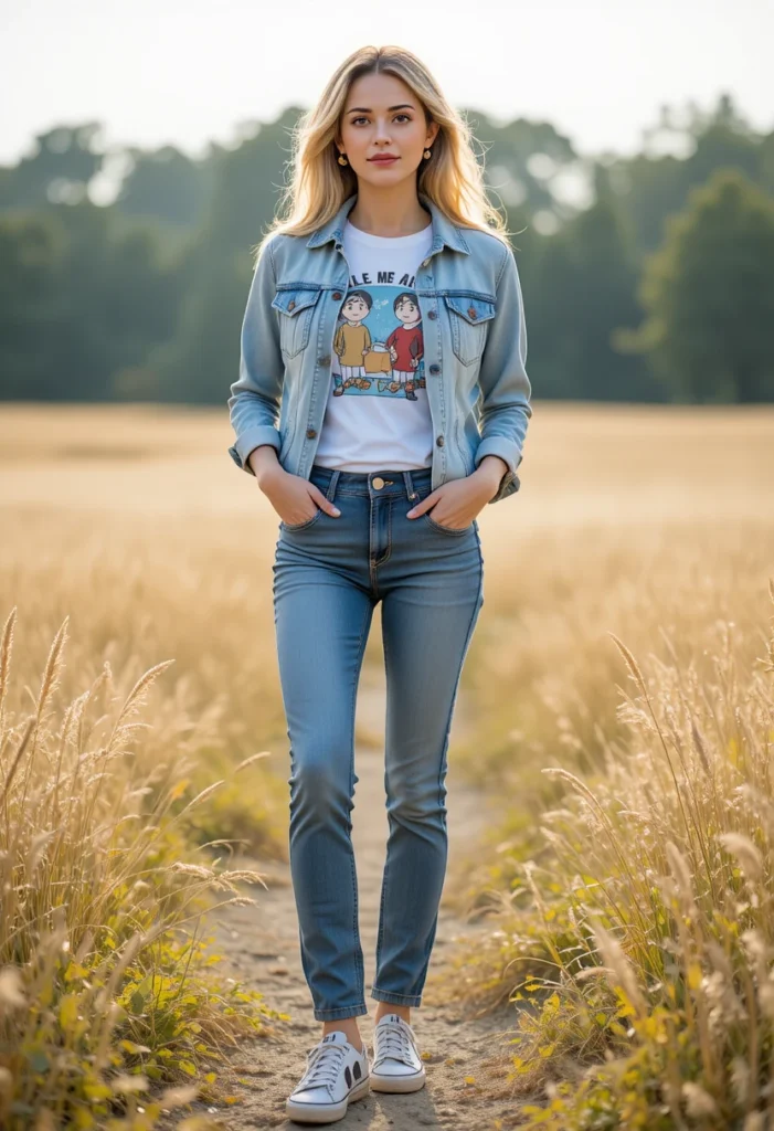 A cute graphic tee layered under a denim jacket gives a stylish but easy ballfield look. This combo works great for spring or fall when the weather shifts quickly from warm to cool. It adds personality without being too dressy, making it perfect for casual baseball days. Pair it with jeans or leggings for a complete, effortless outfit.