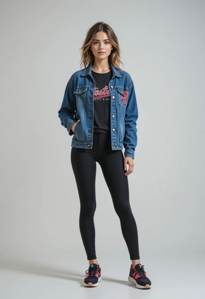 6. Stylish Denim Jacket + Team Tee + Black Leggings