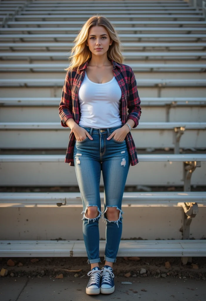 A plaid shirt adds a relaxed, sporty vibe when layered over a simple white tank. Ripped jeans give the outfit a fun, laid-back feel perfect for cheering in the stands. It’s a cute option for moms who like a classic but stylish everyday look.