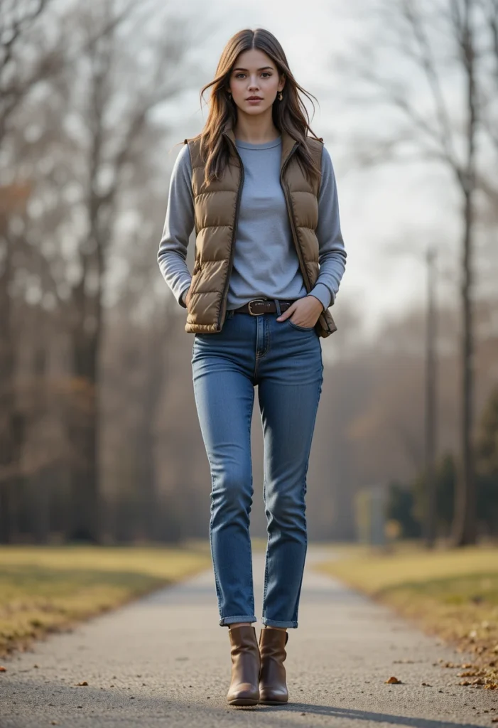 A lightweight puffer vest gives warmth without feeling heavy, making it perfect for chilly mornings. A long-sleeve tee underneath keeps the outfit simple and comfortable. Straight-leg jeans add a clean look that matches well with sneakers or boots.