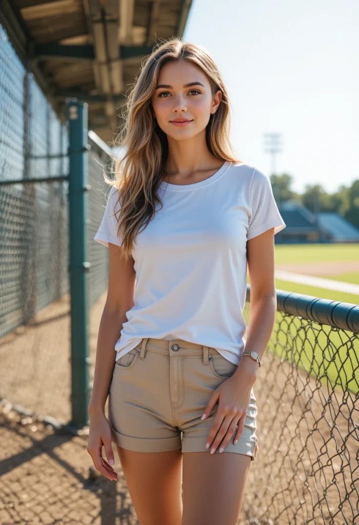 A soft tank top tucked into high-waisted shorts creates a cool and breathable outfit for warm baseball days. It lets you stay comfortable while walking around the field or sitting in the sun for long innings. Throw on sunglasses or simple jewelry for a little extra style. This outfit feels light, flattering, and perfect for summer games.