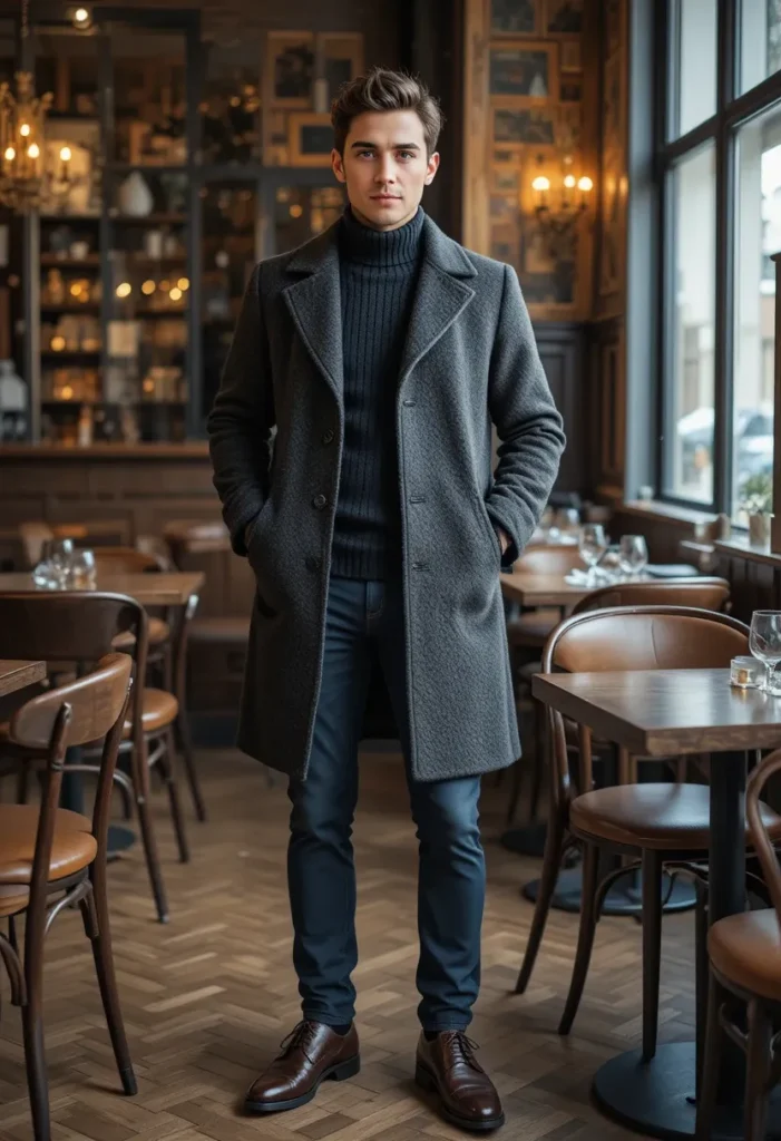 A Chesterfield coat worn over a fitted turtleneck sweater is a sophisticated way to stay warm without compromising style. The classic silhouette of the Chesterfield coat adds a sharp, tailored look, while the turtleneck provides warmth and texture. This outfit is ideal for more formal settings, like dinners, dates, or office events.