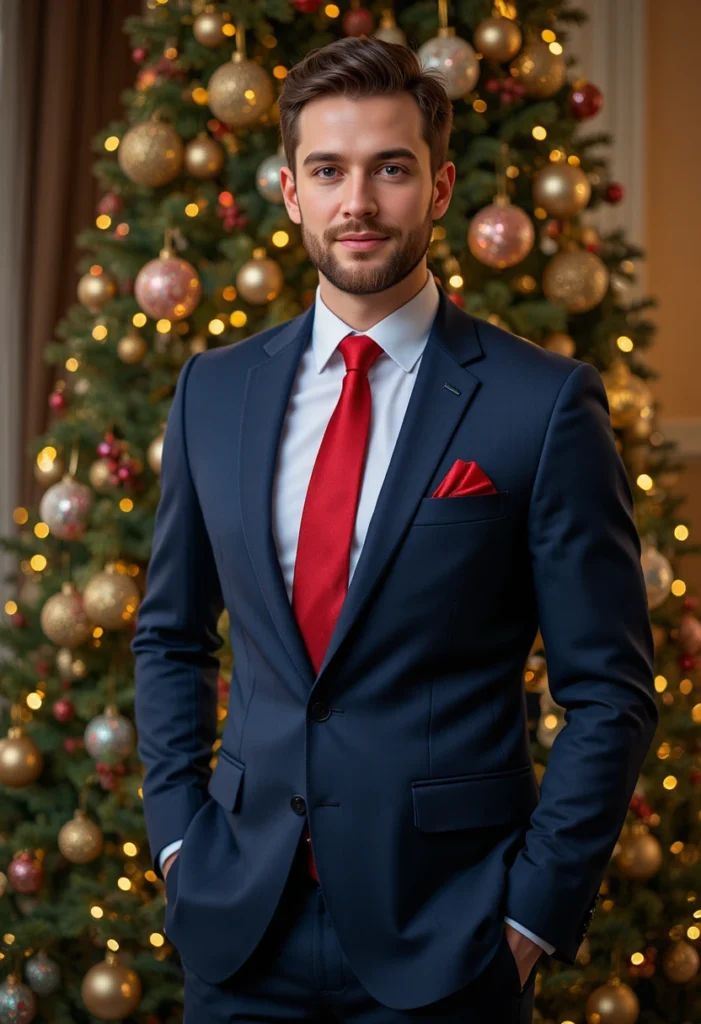 A navy suit paired with a holiday red tie is a sophisticated yet festive outfit for those who want to look sharp at a Christmas party. The navy suit is timeless and versatile, while the red tie adds a pop of color, making it perfectly suited for the season. This is ideal for a formal office Christmas party or a holiday gala where you want to show your festive spirit without sacrificing style.